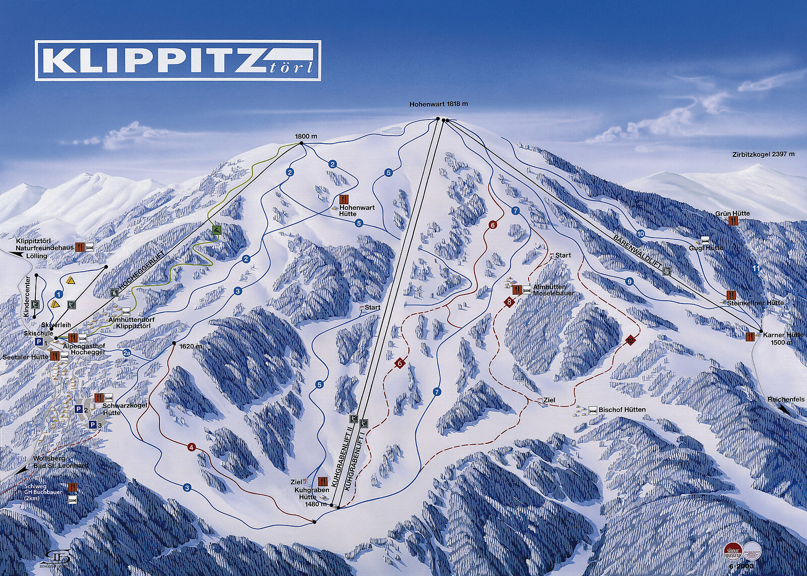 Mit seinem 4er-Sessellift Bärenwald und den dazugehörigen Nordabfahrten ist das Klippitztörl endgültig in die Top-Liga der Kärntner Skigebiete aufgestiegen. Insgesamt 6 Skilifte und ein Gratis - Zauberteppich erschließen auf 12 Abfahrten 40 ha Pisten, der Speichersee mit 44 Millionen Liter Inhalt und die großzügige Beschneiungsanlage garantieren gesichertes Wintersportvergnügen von Anfang Dezember bis ins Frühjahr hinein. Sehr beliebt: Auch Tages- und Stundenkarten werden automatisch auf KeyCards (Einwegtickets) ausgegeben.