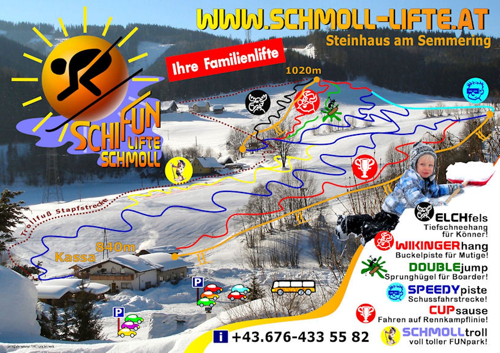 Atemberaubende Sprunghügel für Boarder (bei ausreichender Schneelage), extravagante Buckelpiste (bei ausreichender Schneelage), und der Schmoll-Troll-Kinder-Funpark. Schmoll ist stets bemüht, viele Möglichkeiten mit optimaler Infrastruktur für Ihre Aktivitäten bereit zu stellen.